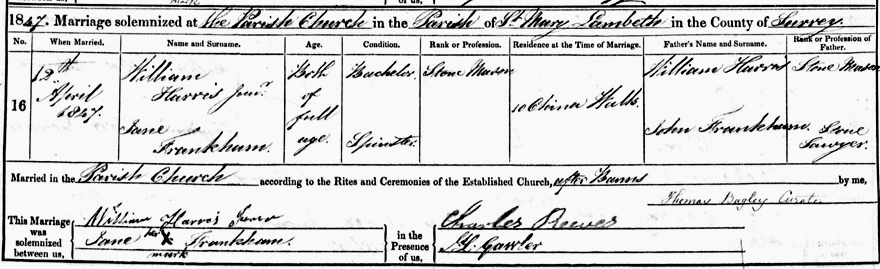 William and Betsy's son William was born around 1828 but we can find no trace of him being baptised. The 1841 census records him living withn his parents at Artichoke Court Granby Place Lambeth. He married on 12th April 1847 Jane Frankham at St Mary's Lambeth they were then living at 10 China Walk Lambeth. Jane was the daughter of John and Martha Frankham who was a stone Mason and originated from Bath Somerset.