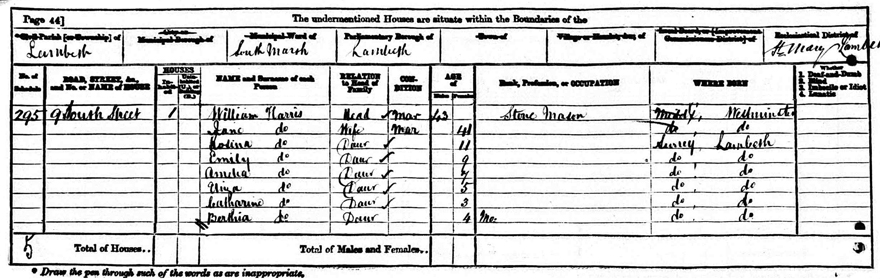 By 1851 the census records them at 8 Haugate Street Lambeth, and in 1861 they were living at 9 South Street Lambeth next door to William's parents at number 11.