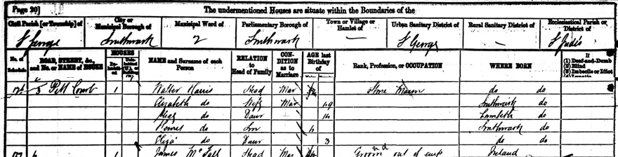 census with his parents at Artichoke Court Grnady Place Lambeth.