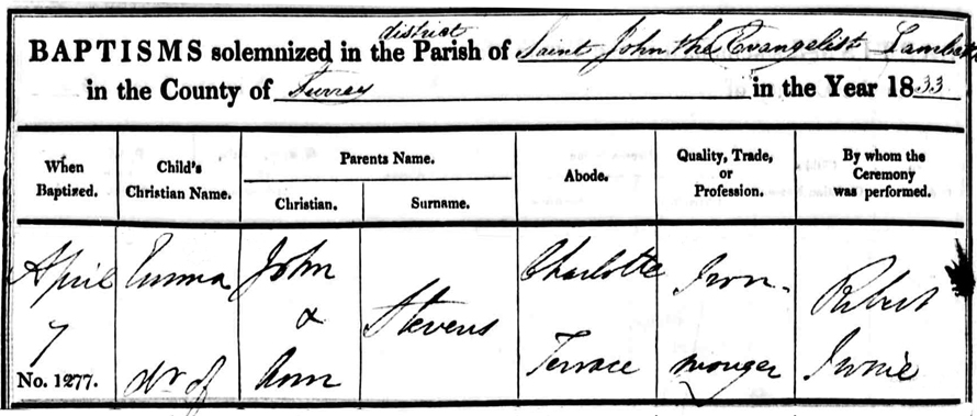 wife was baptised Emma Stevens 7th April 1833 at St John the Evangelist