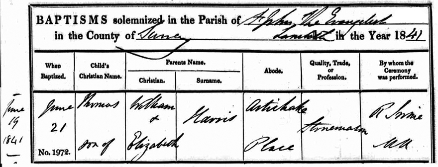Thomas Harris 1841 - 1841 ![]() William and Betsy's last child Thomas Harris was born 19th June 1841. The family were living at Artichoke Place, Upper Marsh Lambeth. Thomas was baptised 2 days later on 21st June at St John the Evangelist Lambeth. We presume Thomas died in infancy shortly after his baptism. |