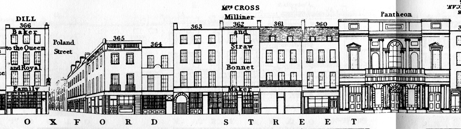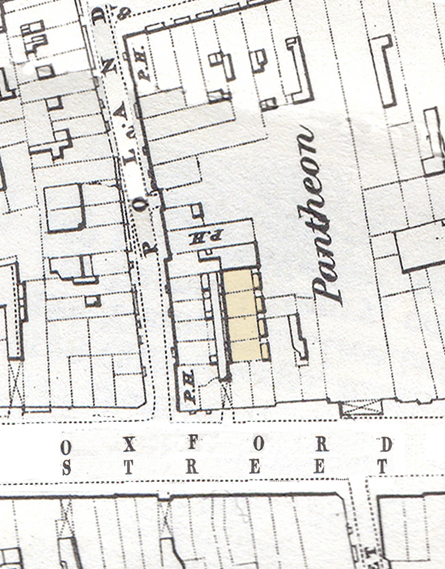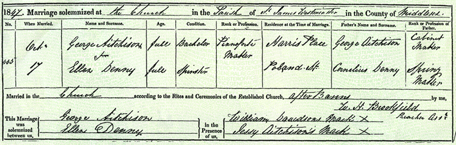 George Aitchison marries Ellen Denny St James Westminster By 1847 George Aitchison's Pianoforte Business had moved to Harris Place in Oxford Street. In October he married Ellen Denny who lived in nearby Poland Street. Her parents, Cornelius & Bridget Denny were coach fitters and upholsterers. One of the witnesses on the above certificate is Georges sister Jessy who was then aged 17. Harris Place was located off Oxford Street behind number 363 and accessed through an archway. The illustration of this section of Oxford Street from the Junction with Poland Street to the Pantheon Bazaar dates from 1838. The map below shows the same area in 1870. An early engraving of St Jame's Church is also shown below. Home | Geoge's Story |