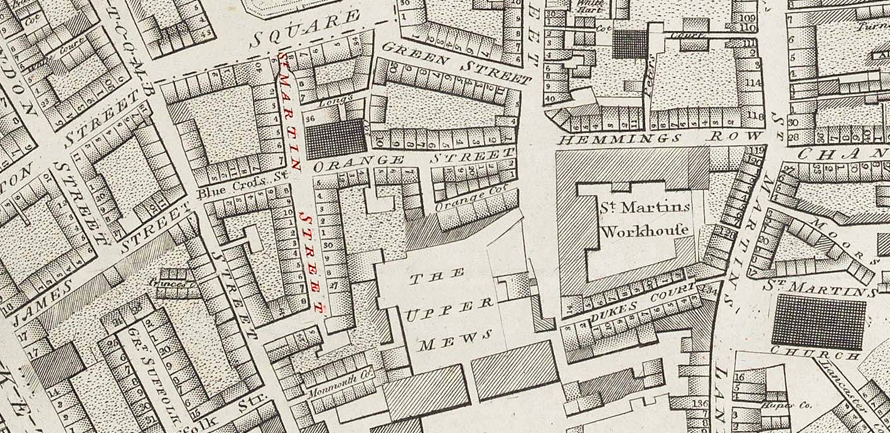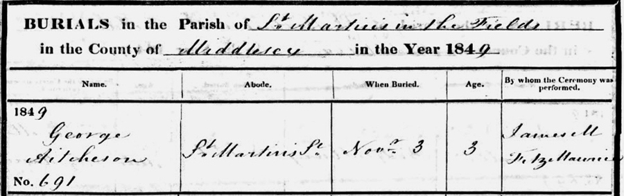 Burial George Aitchison Directly above is the Burial Certificate for George Aitchison aged 3 (days). He was buried at the St Martins in the Fields Cemetery on the 3rd November 1849 just 3 days following his death. The families abode is shown as St Martins Street rather than Charles Street where the Aitchison family had moved to. The map below dates from 1799 and shows the immediate area around St Martins Street. Leicester Square is shown at the top with St Martins Workhouse to the right. .......Home | George's Story. |