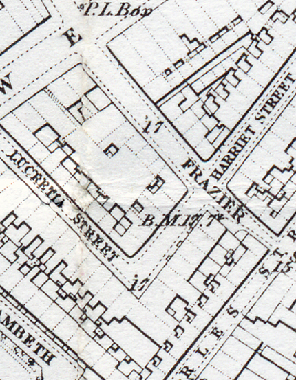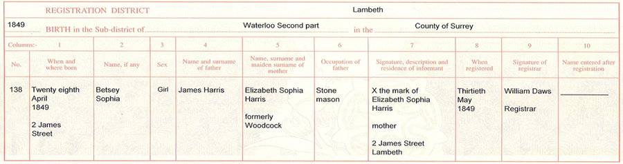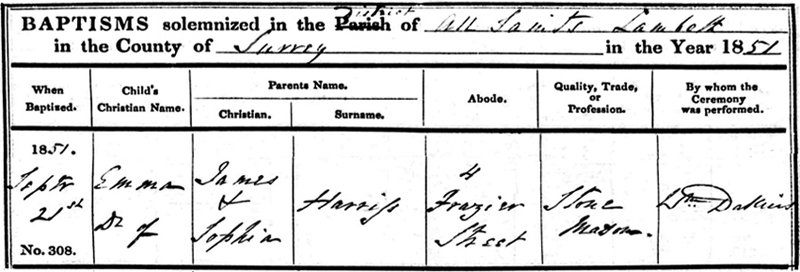 Baptisms ......Betsy & Emma Harris When Jame's and Sophia's second child Betsy Sophia was born on the 28th April 1849, the family were living at 2 James Street, Lower Marsh, Waterloo. When she was Baptised on the 29th September 1850 the family had now moved to 4 Lucretia Street on the south side of Lower Marsh. Jame's and Sophia's next child was baptised Emma Harris on 21st September 1851 at nearby All Saints Church. This child was later known as Emily Sophia Harris (later to marry George Musgrove in 1871). The family were now living at 4 Frazier Street Lower Marsh. There is no official record of the birth of Emma being registered, but she must have been born after the 1851 census in March otherwise she would have been listed with her parents. As the area has been completely redeveloped none of the properties metioned survive. The continual developement of Waterloo railway station changed most of the area. ........Home | Georges Story One |