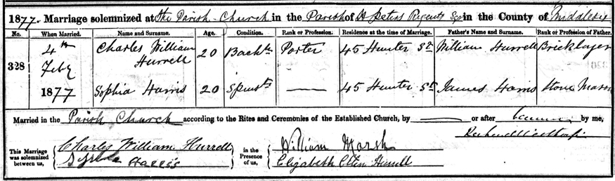 Sophia Harris married Charles William Hurrell in St Pancras on 4th February 1877. No information can be found on what happened to them after this date.