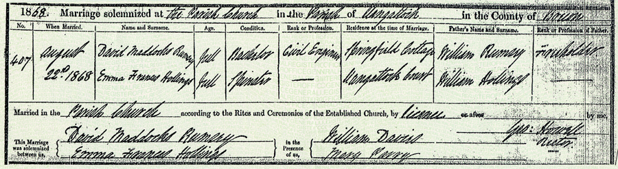 ... 1868 Marriage Emma Frances Hollings Llangattock Following the death of her parents in Hoarwithy Herefordshire in 1867, Emma Frances Hollings had moved to Llangattock near Crickhowell in Breconshire. She was now living at Llangattock Court pictured below left. On 22nd August 1868 she married David Maddocks Rumsey at St Catwg Church Llangattock. He was Born in 1841. His parents William and Elizabeth Rumsey were publicans at the short lived Barley Mow pub in Bridge Street Crickhowell. Elizabeth died shortly after, his father then became a Relieving Dfficer for the district. David became a civil engineer but following his marriage to Emma he became a publican. |