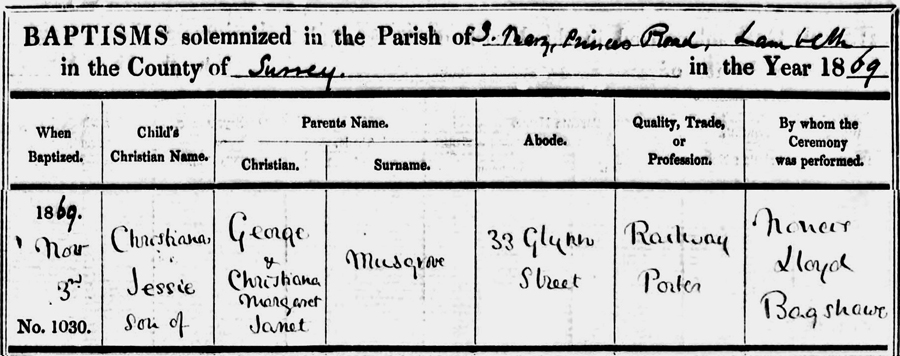 By November 1869 the Musgrove's had moved to 33 Glyn Street, Upper Kennington