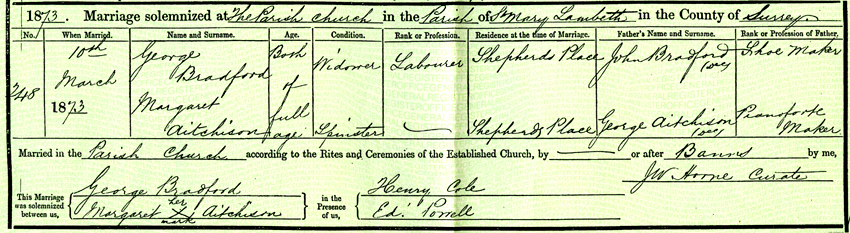 Aitchison marries George Bradford at St Mary's Lambeth 1873