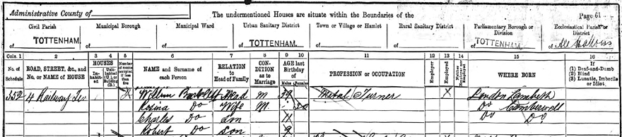 dates from 1891 and shows William and Rosina living in Tottenham at 4