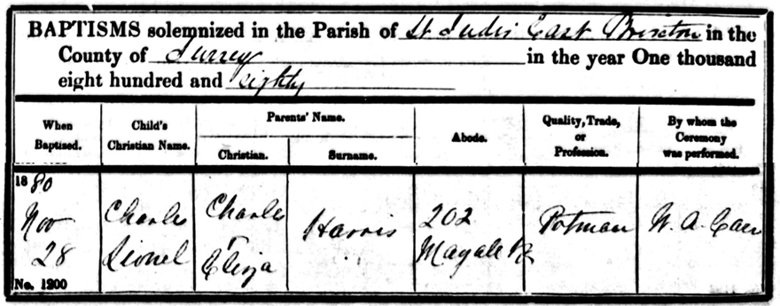 baptism certificate of Charles and Eliza's first son, Charles Lionel Harris.