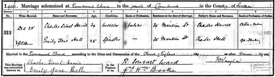 Harris married Emily Jane Hall on Christmas Day 1904. His occupation is