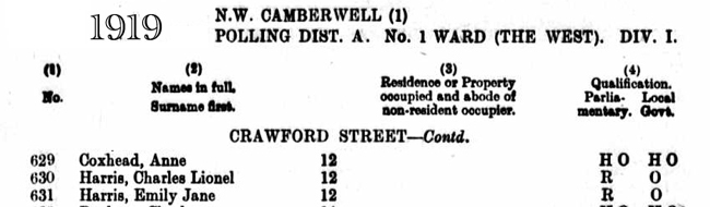 Harris and family had moved by 1919 to 12 Crawford Street Camberwell.
