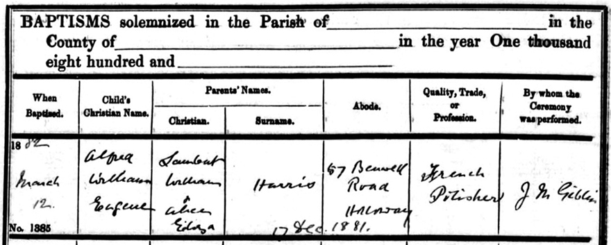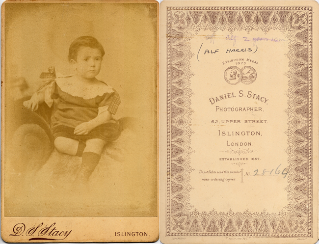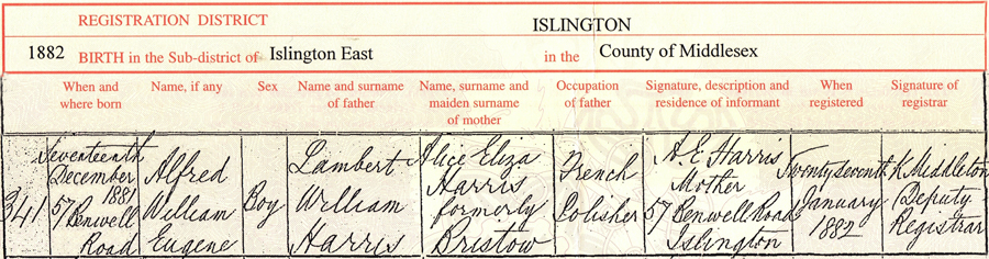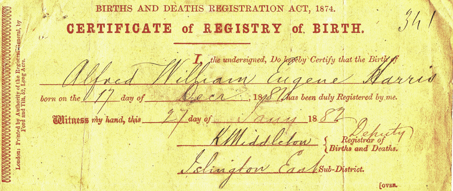 Birth of ...Alfred Harris The certificates above and below show the registration of birth in December of Alfred William Eugene Harris. He was born at 57 Benwell Road the joint home of the Harris and Musgrove families at this time. Alfred is photographed aged 2 years10 months in 1884. ..Home | Georges 2 |