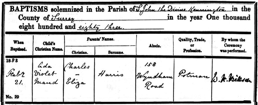 baptism certificate of Ada Violet Maud Harris who was baptised 21st February