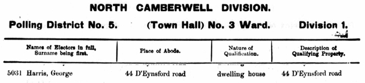 The family are living at 44 D'Eynsford Road Camberwell Green. The Electoral Register directly below dates from 1910 and shows the Ekector at this address as George Harris. We do not know if he is a relative.