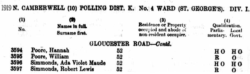The Electoral Register below dates from 1919. The family are now living at 52 Gloucester Road