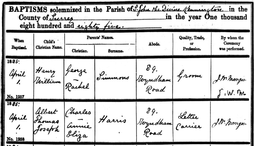 Albert was baptised with Henry William Simmons whose parents George and Rachel Simmons lived in the same house as Charles and Annie Harris at 89 Wyndham Road Camberwell.