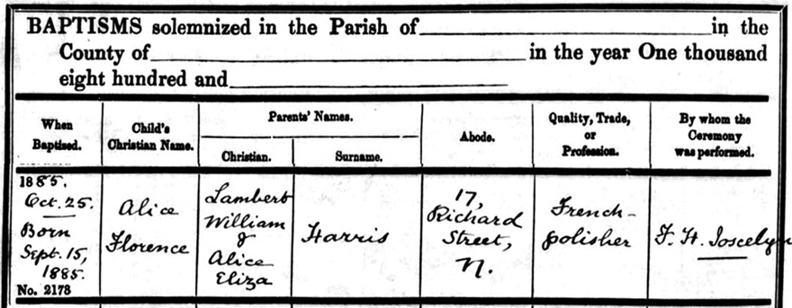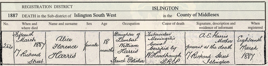Death of Alice Florence Harris Lambert and Alice Harris's daughter Alice Florence died aged 18 months on the 15th March 1887. The family were living at 17 Richard Street (now named Richie Street) Islington. Home | George's Story 2 |