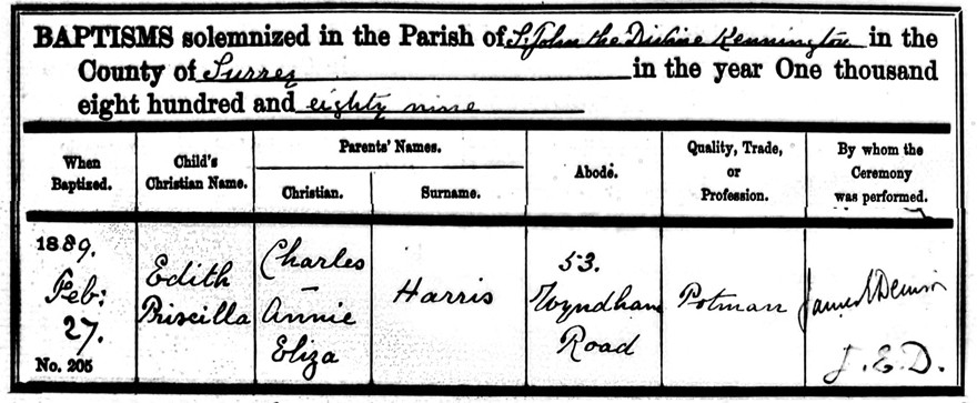 Harris was baptised 27th February 1889 at St John the Devine Kennington.