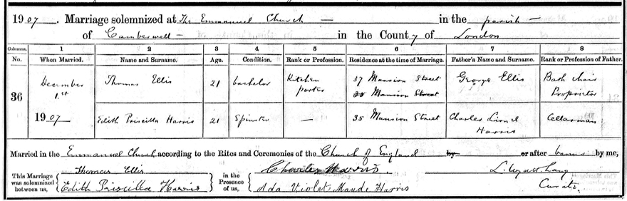 Edith married Thomas Ellis on 1st December 1907 at Emmanuel Church Camberwell.