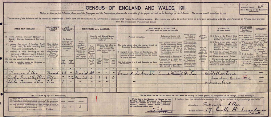 The 1911 census shows Thomas and Edith living on the Isle of Sheppey in Kent. They were living at 17 Castle Street Queenborough. The census shows they have one son, Leslie Thomas Ellis aged one who was born in Queenborough.