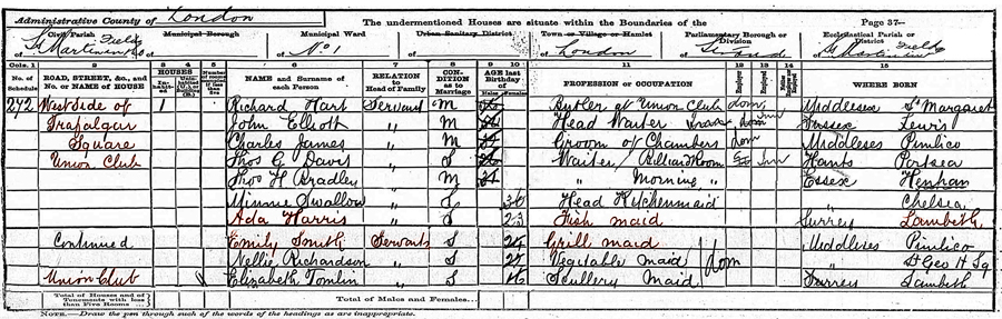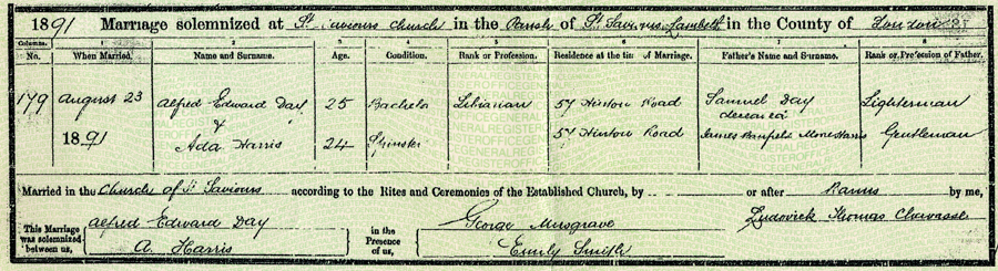 Ada Harris marries Alfred Edward Day at St Saviour's Herne Hill Ada Harris was the youngest daughter of James Banfield Moore Harris, and had lived with the Musgrove and Harris families when they were together at Benwell Road in the early 1880's. Ada Harris married Alfred Edward Day on 23rd August at St Saviour's Church Herne Hill. The certificate above shows the couple living at 57 Hinton Road, a short distance from the church (see map below). This Victorian church became redundant in later years and was eventually demolished in 1981 when the land was redeveloped. The 1891 census below was taken six months earlier in March and shows Ada Harris as an employee of The Union Club in Trafalgar Square. The job provided accommodation on the premises. Ada was employed as a fish maid and is listed with her friend Emily Smith who was a grill maid. Emily is shown as a witness on the above wedding certificate with Ada's brother in law George Musgrove. ...........................................................Home | George's Story 2 |
