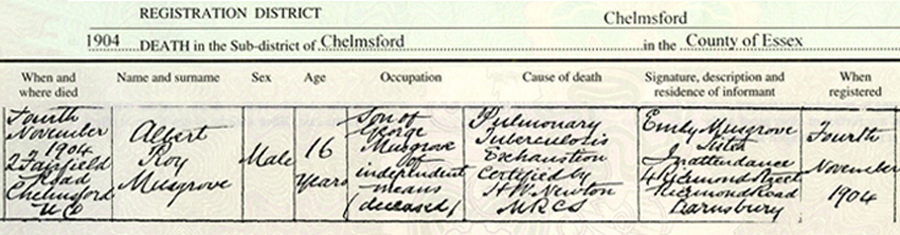 death certificate of Albert Roy Musgrove (known as Roy) who died