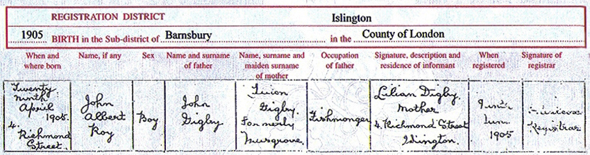 Birth of John Albert Roy Digby John and Lilly Digby's first son John Albert Roy Digby was born 29th April 1905 at 4 Richmond street, off Thornhill Square Barnsbury.The 1871 Map of Highbury and Islington showing the Thornhill Square area of Barnsbury.4 Richmond Street is the house highlighted below and to the right of the square. The remaining Musgrove family with Emily at its head lived in this house, Emily eventually married George Ruff whose family lived in Clayton Street highlighted top left. We are sure that you agree this is a beautiful map and the area remains virtually unchanged over 130 years later. St Andrews Church is highlighted in green is where Lillian Musgrove married John Digby. .......................................Home | George's story 3 |