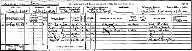 The Wornham family by 1901 had moved 97 Grove Hill Road Redhill (pictured above present day). The family are shown on the 1901 census below and comprise of Peter Wornham 54 and his wife Janet 54, and 3 of thier children, William 26, Janet 14 and John Roger Wornham 12.