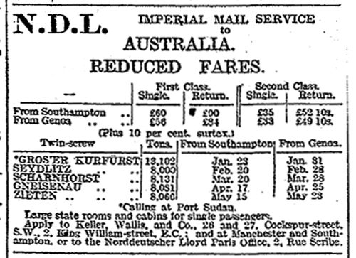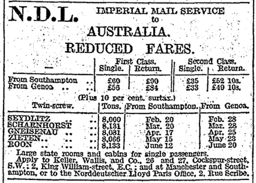 It was decided that the depature date would be set for January 1911 with the various parts of the family splitting into 3 groups. The first and second groups would depart from Southampton on Nord Lloyd ships from Bremen Germany bound for Australia. The final group would leave London on a British ship. Why they chose to travel this way and not together on one vessel is not known.