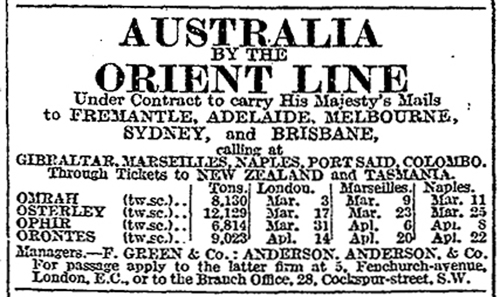 Frank Wornham's wife Alice, their daughter Eleanor and Alice's parents William & Emma Jane Hood made up the 3rd party departing London on the Orient Line ship Omrah on 3rd March 1911. They arrived 12th April.