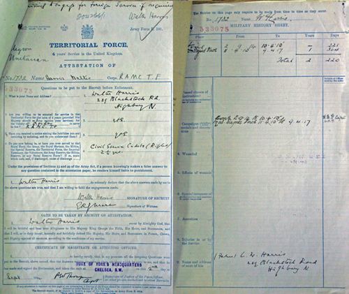The above ducument shows Walter enlisted as a Private at Chelsea in Sept 1914. He