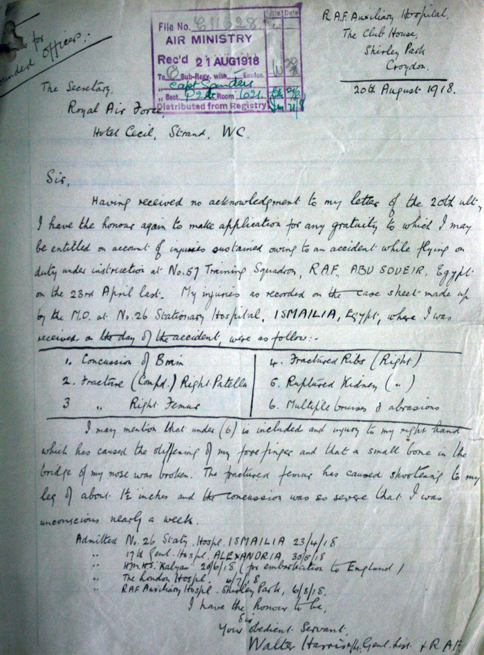 Walter's injuries were serious. He eventually returned to England and recuperated at the