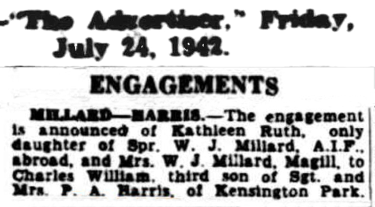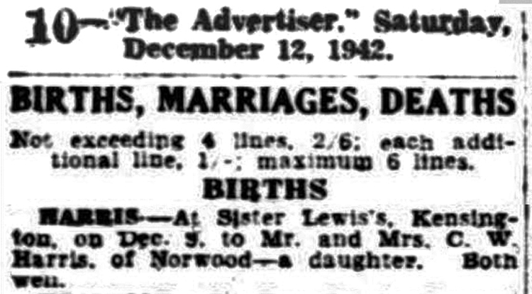 The Adelaide Advertiser reported December 12th 1942 the birth of a daughter to Charles and