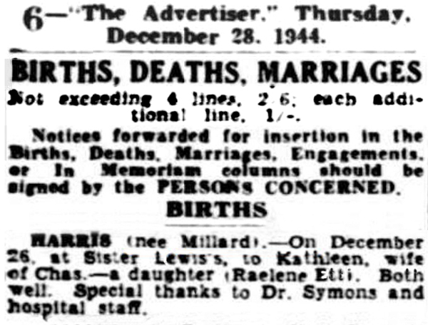 The Adelaide Advertiser reported December 28th 1944 the birth of a daughter to Charles and