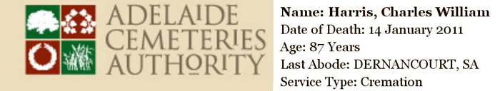 Charles William Harris lived to the age of 87 and died in 2011 in Dernancourt, Northeast of Adelaide. We have no details of his wife Kathleen or any children.