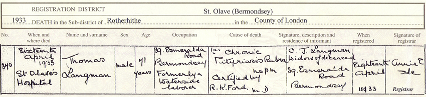 died 16th April 1933 at St Olave's Hospital Bermondsey. The above certificate