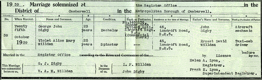 Germany in September 1939, George Digby married Violet Willden at Camberwell