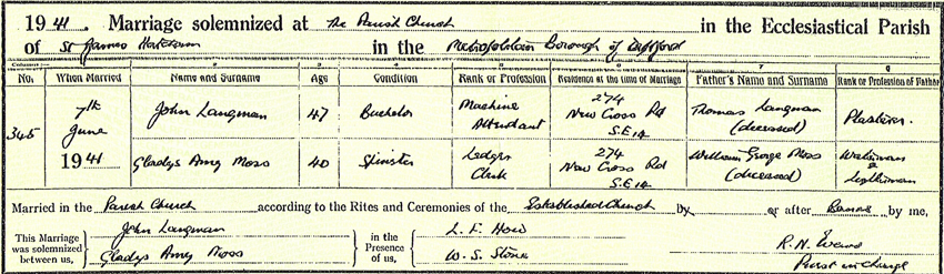 son John Langman married Gladys Amy Moss at St James Church, Hatcham