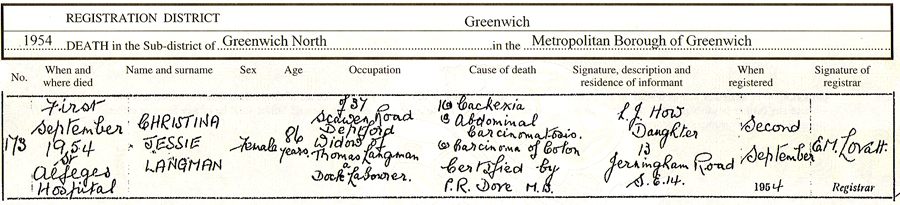 Langman died on the first of September 1954 at St Alfeges Hospital in Greenwich.