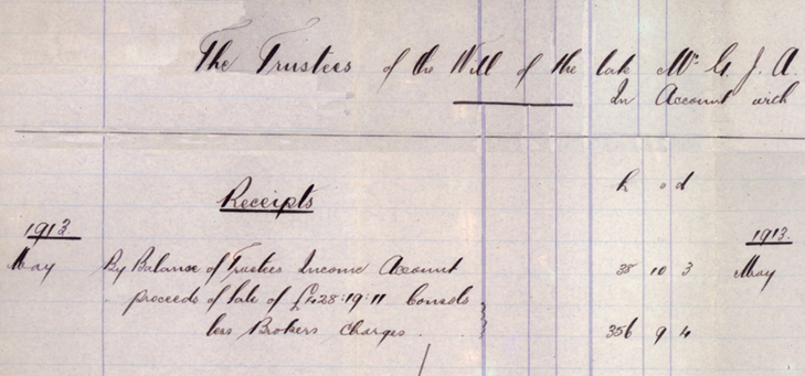 George Musgrove first left his estate to his wife Emily on her death he added a codicil instructing trustees to provide an income to the surviving children. He died in 1901. When the youngest reached twenty one the residue should be distributed equally to the surviving children. This document is the agreement between the trustees and the children when Rupert Claude had reached twenty one and it was time to pay out. It was too big to show on one page and so if after reading this just click on top right, bottom left then bottom right. The document is dated May 1913. |