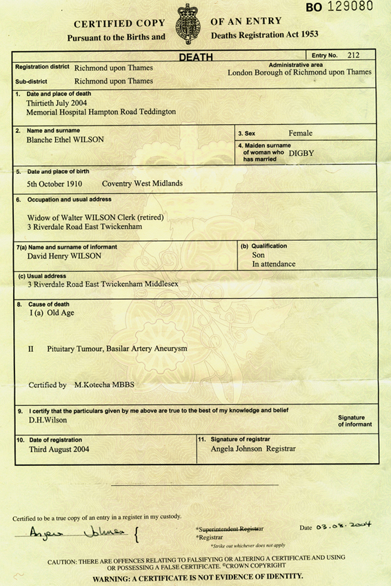 Death certificate of Blanche Wilson (nee Digby) grand daughter of George and Emily Musgrove. Her son Roy was in attendance. Home | Wilson | Tribute