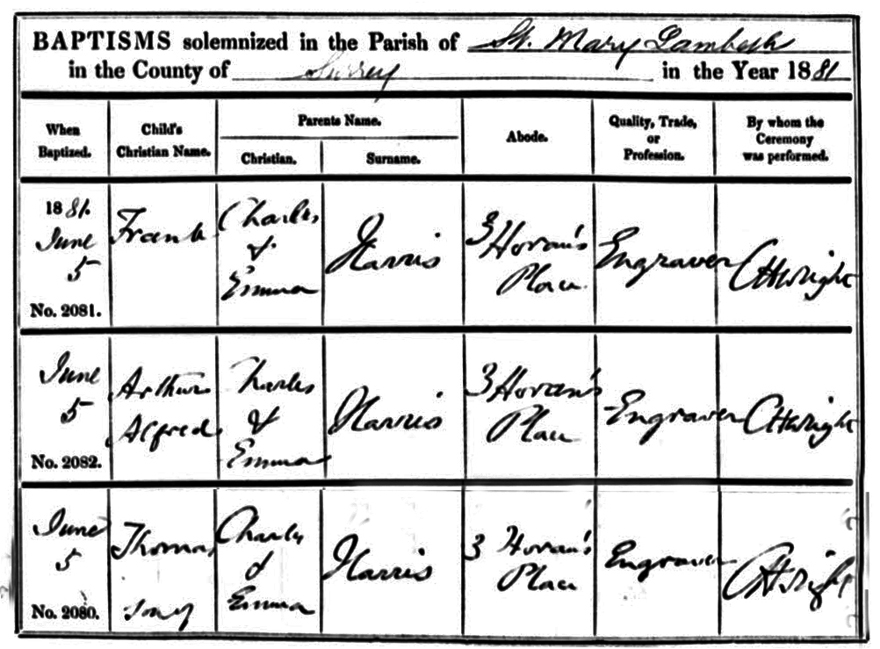 baptism certificate of Charles & Emma's son Albert John Harris who