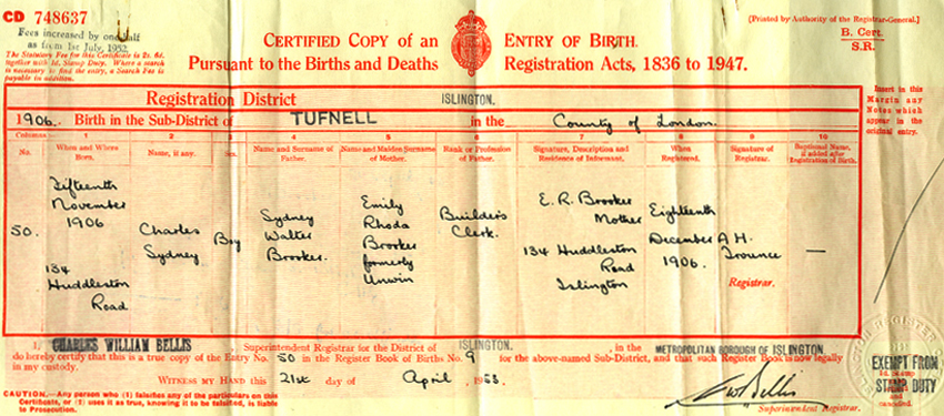The birth certificate of Charles Brooker Husband of Winnifred Brooker