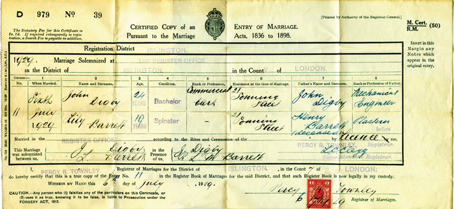 This marriage certificate of Jack Digby and Lillian Barratt it is a copy of the original issued on the day of the marriage 6th July 1929 as can be seen by the date. The original is always kept in the record office.