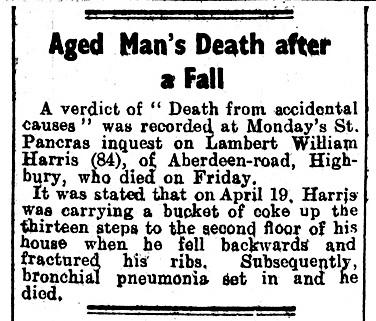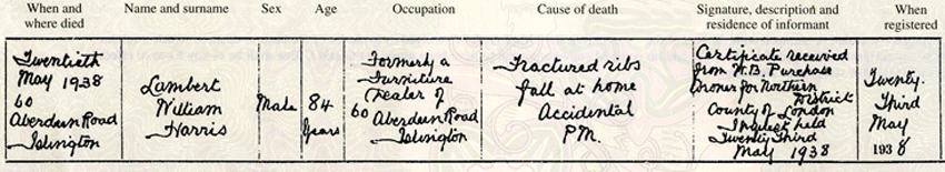 Lambert William Harris sister of Emily Harris as can be seen died of a fall at his home at Aberdeen Road there was an inquest which found that his death was accidental. Below left is a portrait of Lambert. Right below is a recent picture of 60 Aberdeen Road.