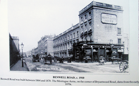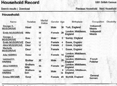 As can seen on this copy of the 1881 census George Musgrove and his family lived at 57 Benwell Rd Holloway, including his wife Emily their son George, daughters Emily, Alice, Marbelle (Lilly), her sister Ada her brother Lambert H, his wife Alice and son Lambert T. finally a servant Emma Brown. No. 57 was bombed during WW11 along with a large part of the odd numbered houses. My pic is the even numbered side 120 years later it is still an elegant old street. |