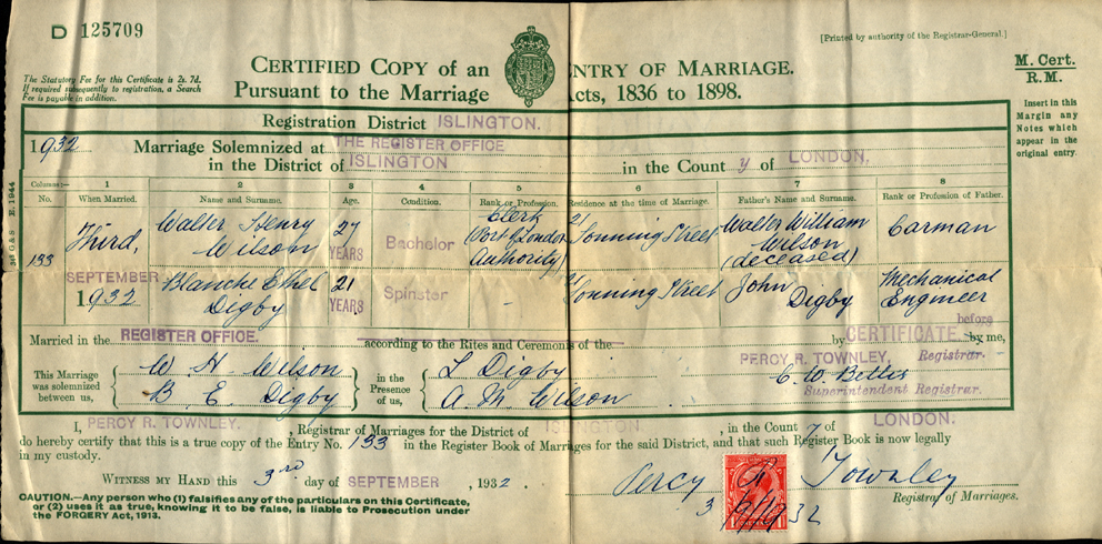 The marriage certificate of Walter Wilson and Blanche Digby 3rd Sept 1932