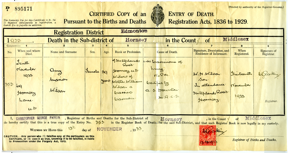 Death Certificate of the mother of Walter William Wilson Husband of Blanche Wilson (Digby) who was the grand daughter of George and Emily Musgrove.