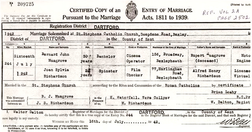 above shows Bernard's occupation as Cinema Operator, and Joan as Film